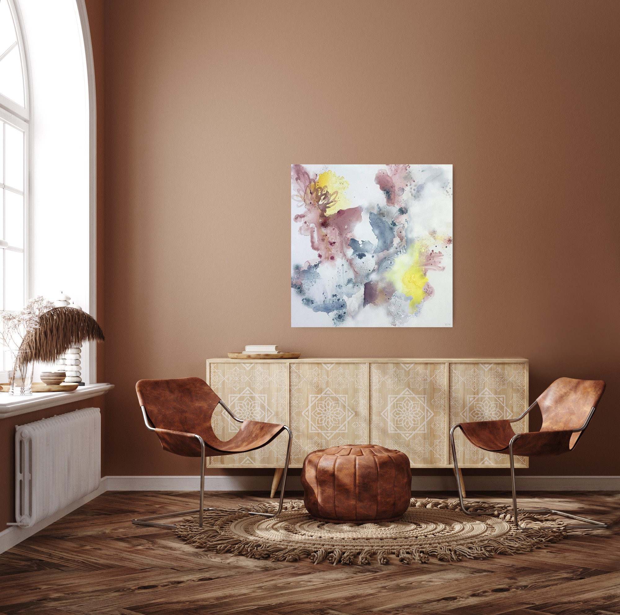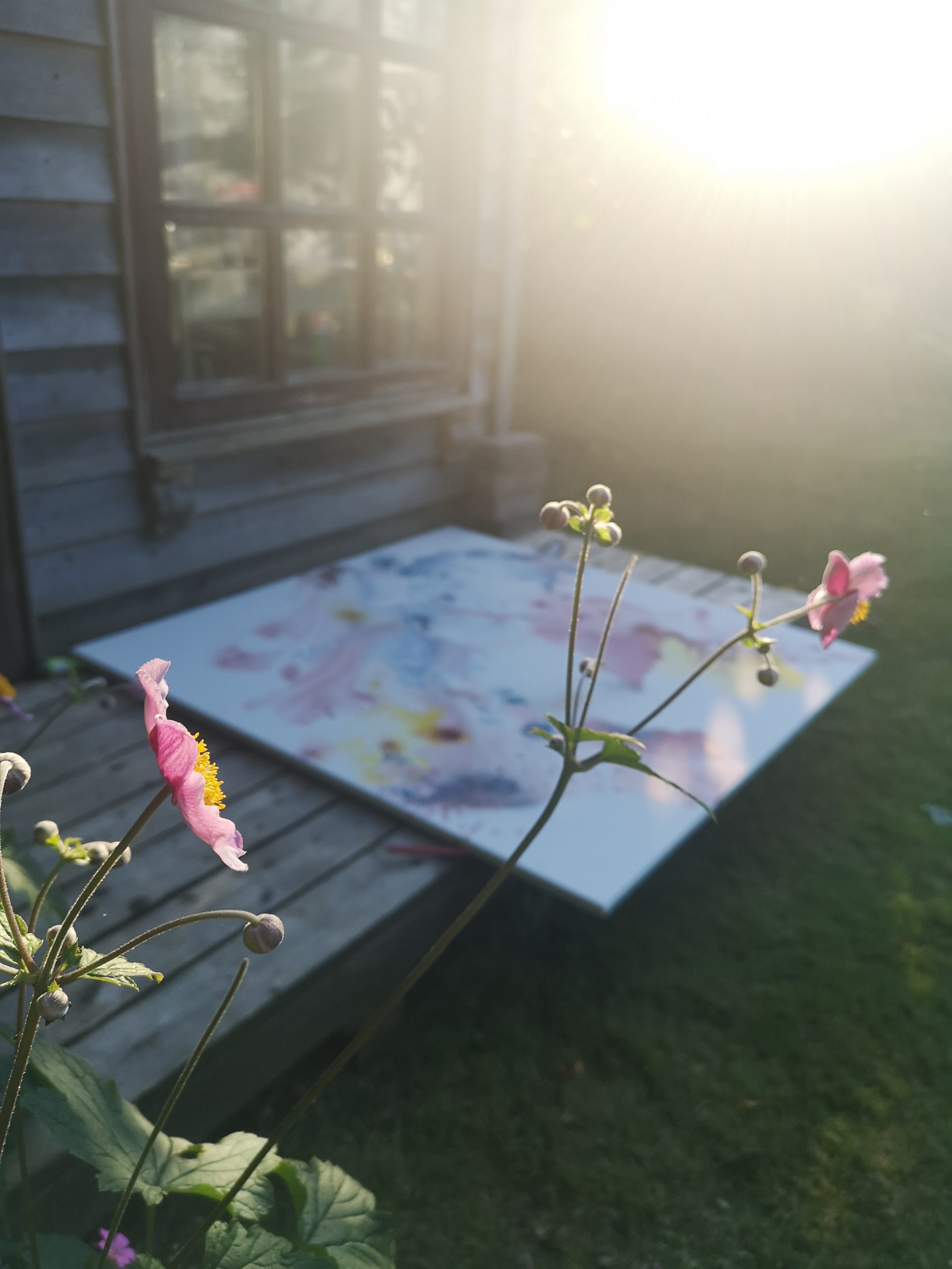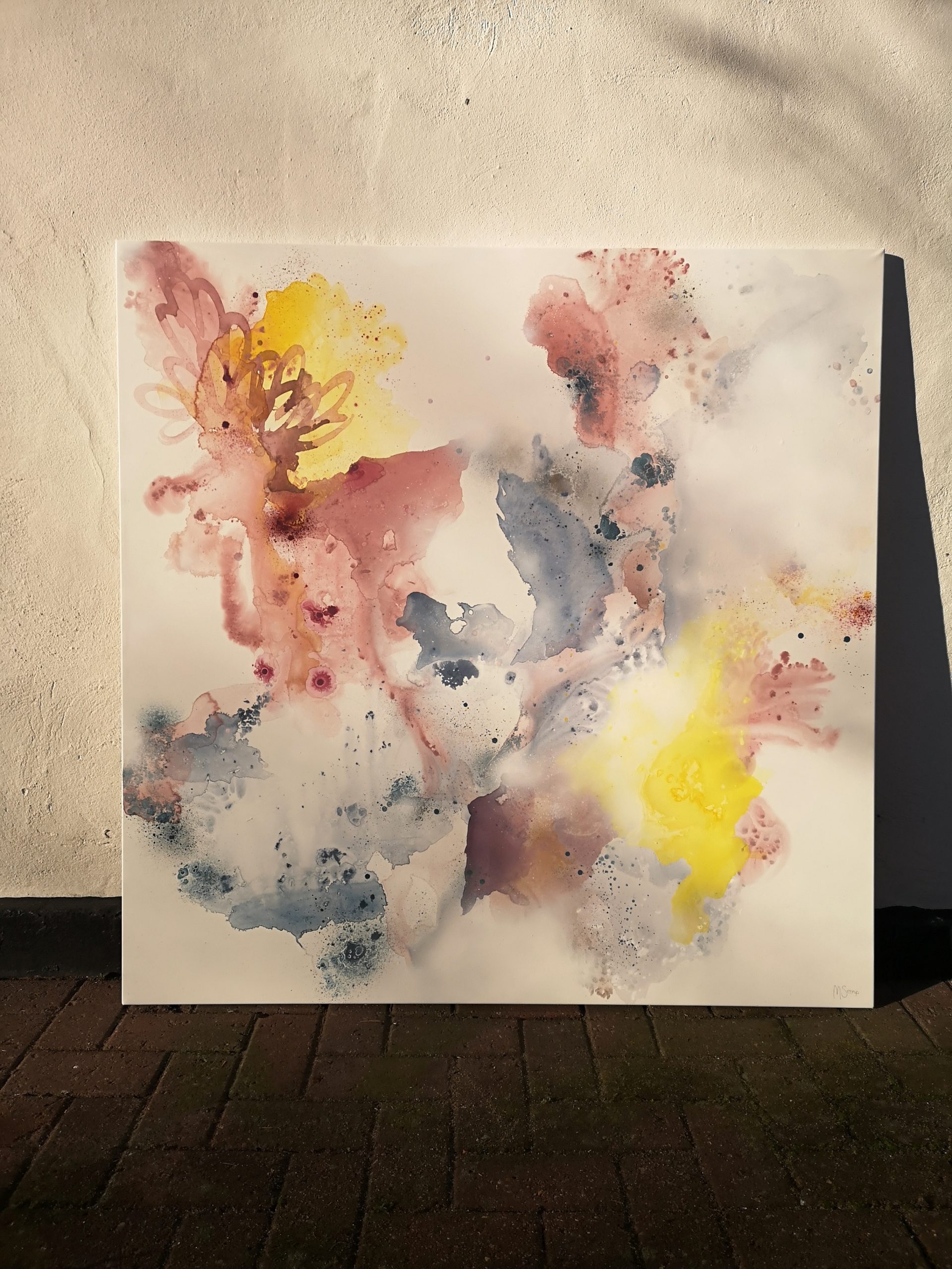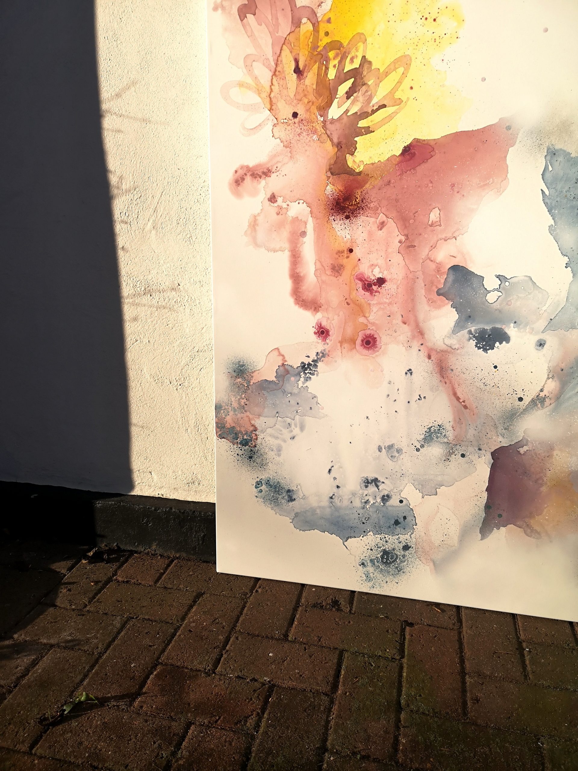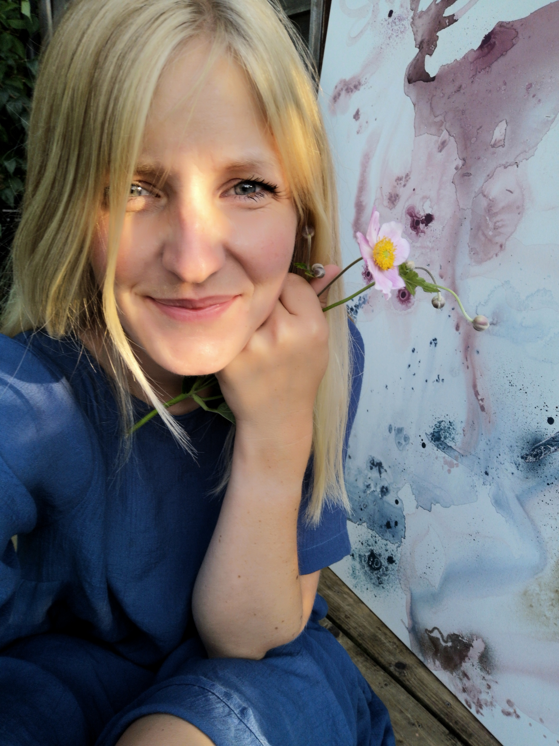 Hi. I’m Michaela and I paint joyful abstract paintings. This piece I’m presenting for you here is called “Sjælefred” (in danish) /”Peace In My Soul”. (To get the story behind this piece you can watch the video). I paint with acrylics and spraypaint. When I paint it’s like talking with God. It’s where I renew my strength. Long story short – I started painting two years ago when I was home sick with depression and anxiety. Painting was like seing the light in the middle of a big dark tunnel. Connecting with God through making art saved me. 💛 Today I use art through ups and downs.